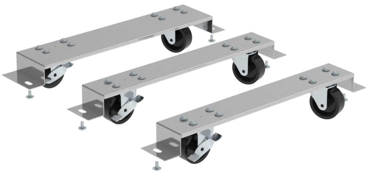 (6) HD swivel casters (2 with brakes), (3) steel rails and hardware